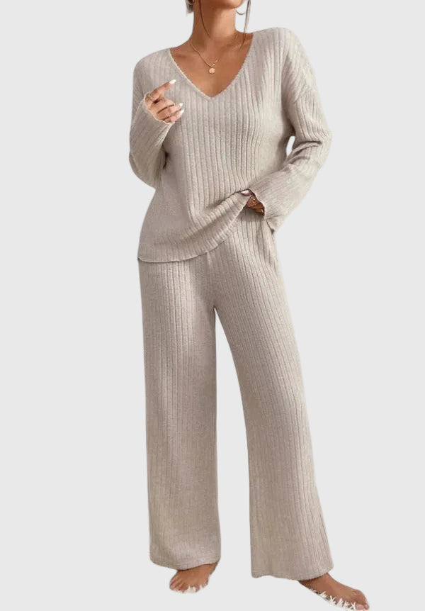 Elevate your at-home wardrobe with this cozy knitted lounge set, featuring a soft V-neck sweater and wide-leg pants with a subtle ribbed texture. Designed for comfort and elegance, it’s perfect for slow mornings, work-from-home days, or casual errands in style.